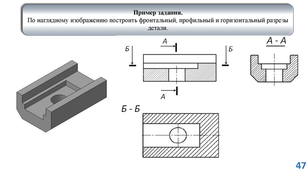 Пример задания.По наглядному изображению построить фронтальный, профильный и горизонтальный разрезы