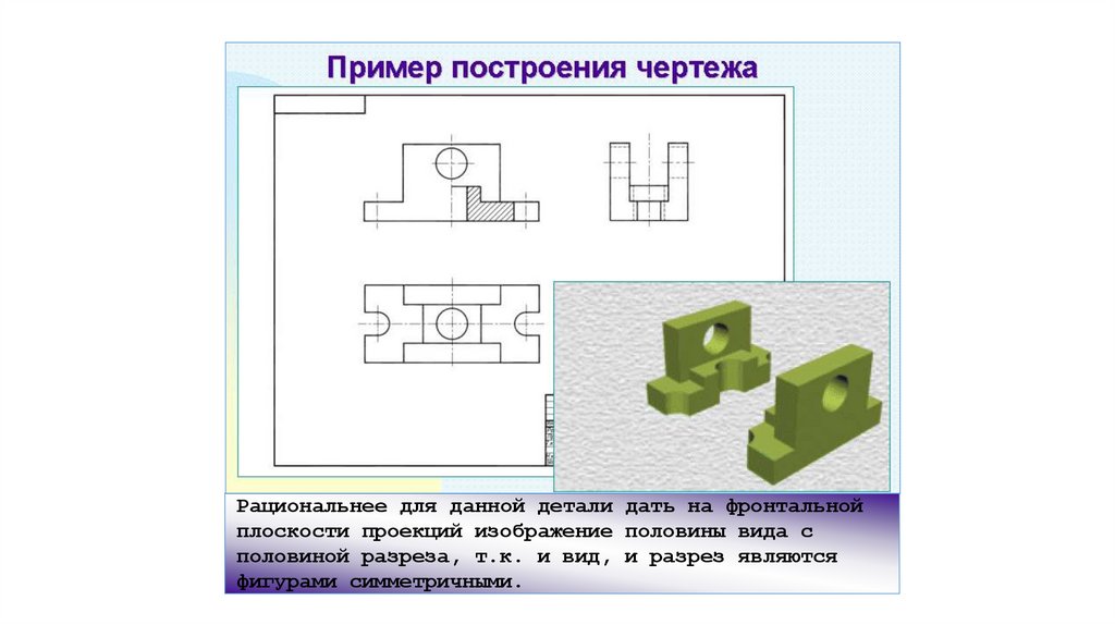 Рациональнее для данной детали дать на фронтальнойплоскости проекций изображение половины вида с