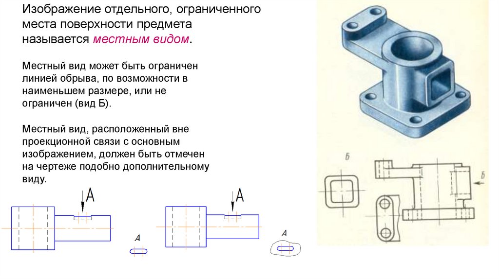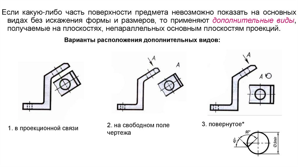 Если какую-либо часть поверхности предмета невозможно показать на основныхвидах без искажения формы и размеров, то применяют дополнительные виды,