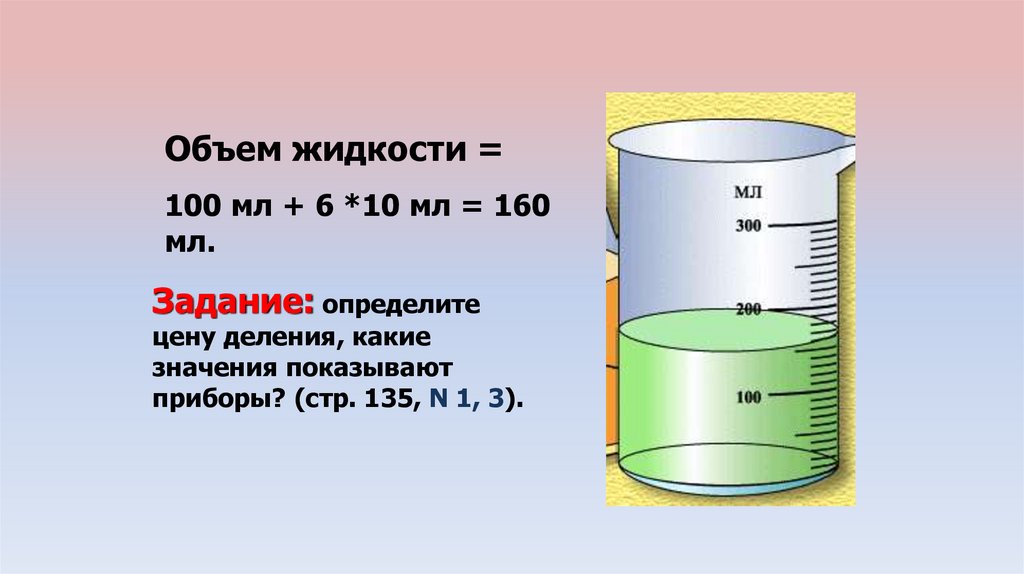 Объем жидкости =100 мл + 6 *10 мл = 160