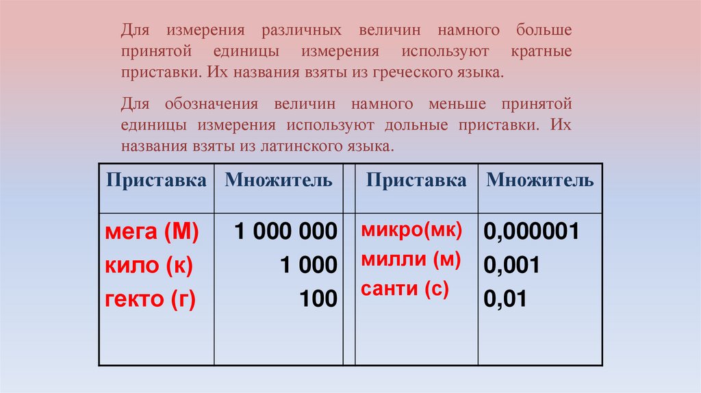 Для измерения различных величин намного большепринятой единицы измерения используют кратные
