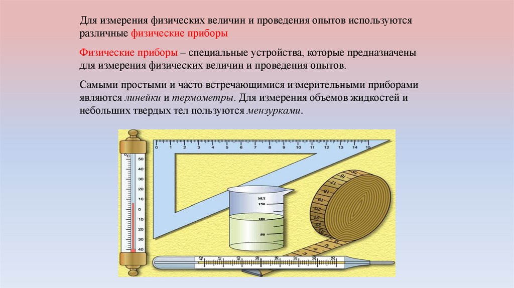 Для измерения физических величин и проведения опытов используютсяразличные физические приборы
