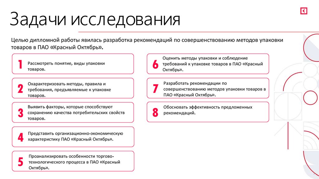 Задачи исследованияЦелью дипломной работы явилась разработка рекомендаций по совершенствованию методов упаковки
