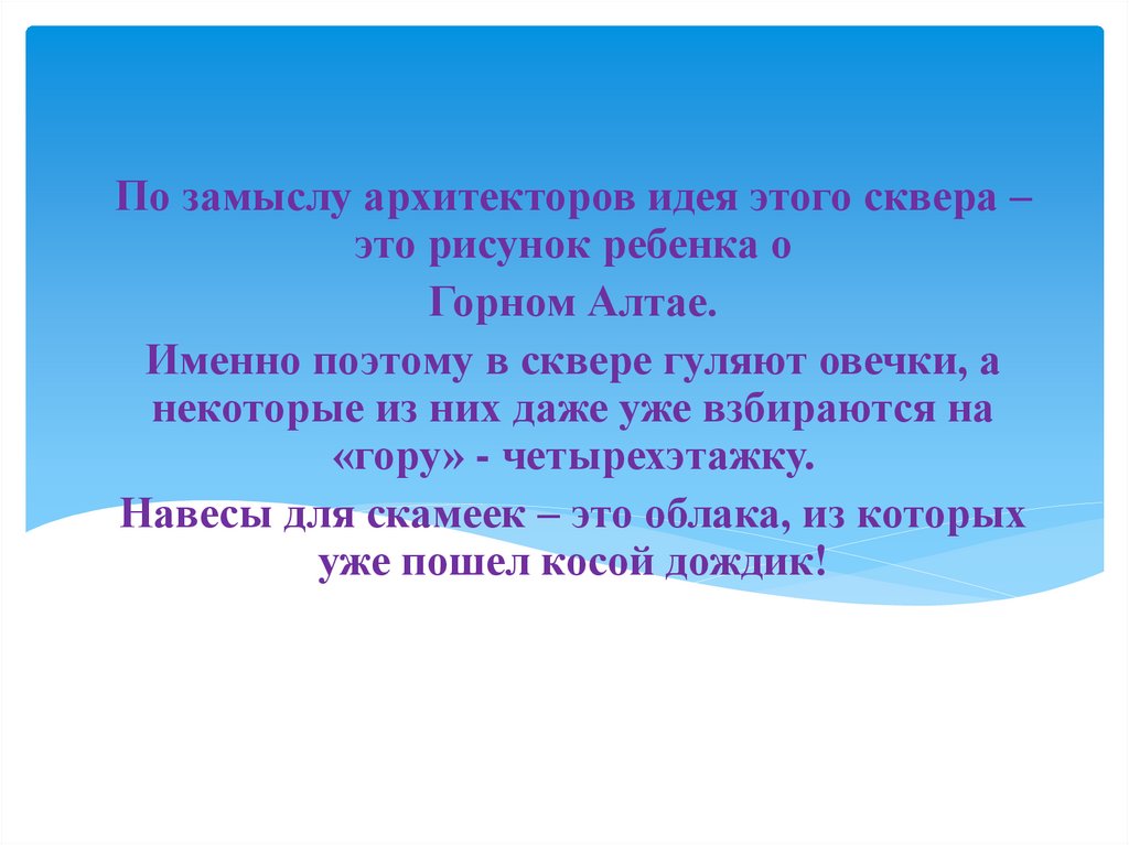 По замыслу архитекторов идея этого сквера –это рисунок ребенка о