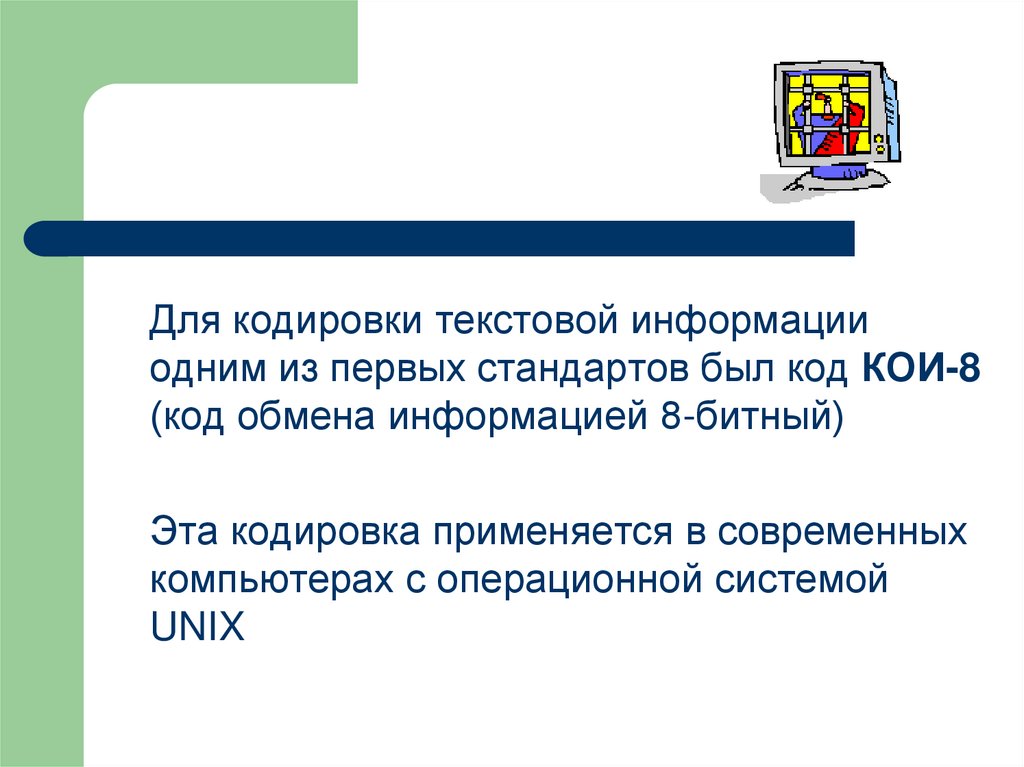 Для кодировки текстовой информацииодним из первых стандартов был код КОИ-8