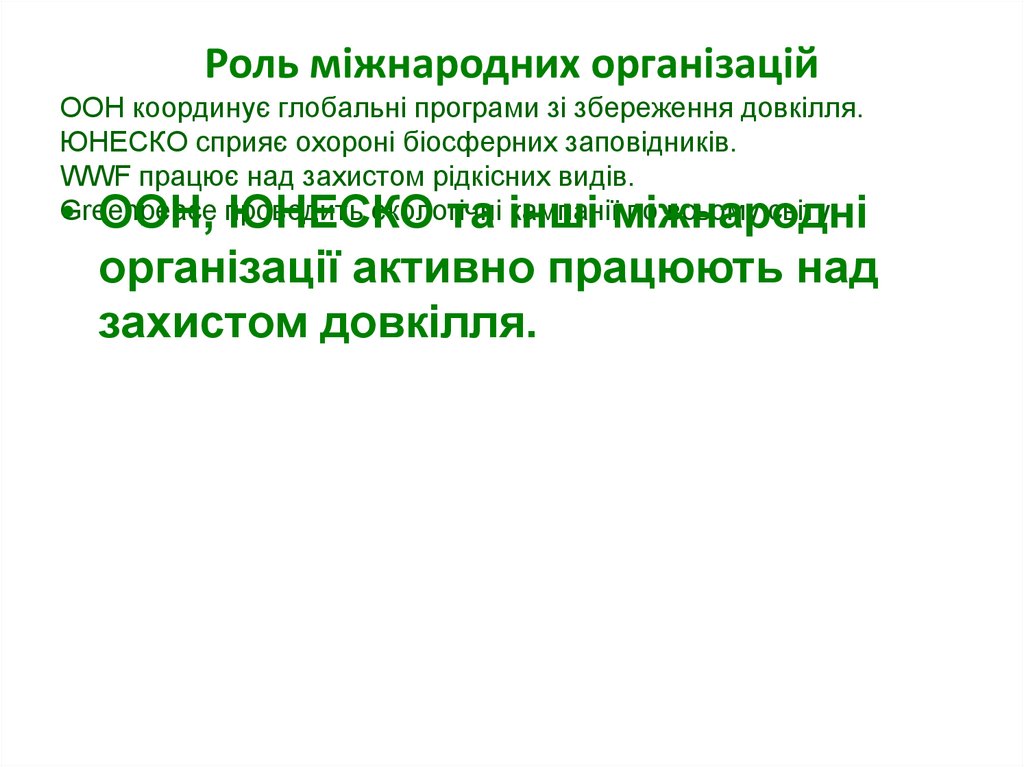 Роль міжнародних організаційООН координує глобальні програми зі збереження довкілля.