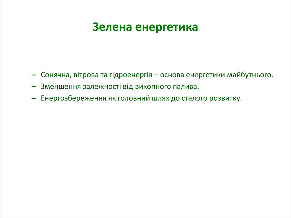 Зелена енергетика– Сонячна, вітрова та гідроенергія – основа енергетики майбутнього.