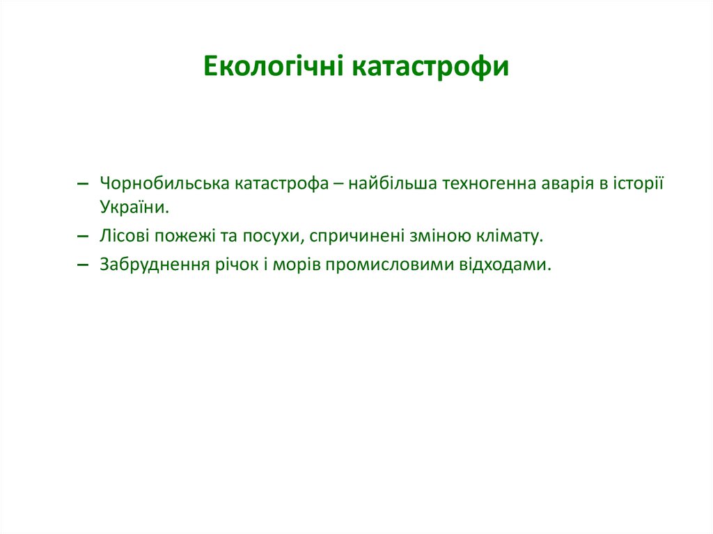 Екологічні катастрофи– Чорнобильська катастрофа – найбільша техногенна аварія в історії