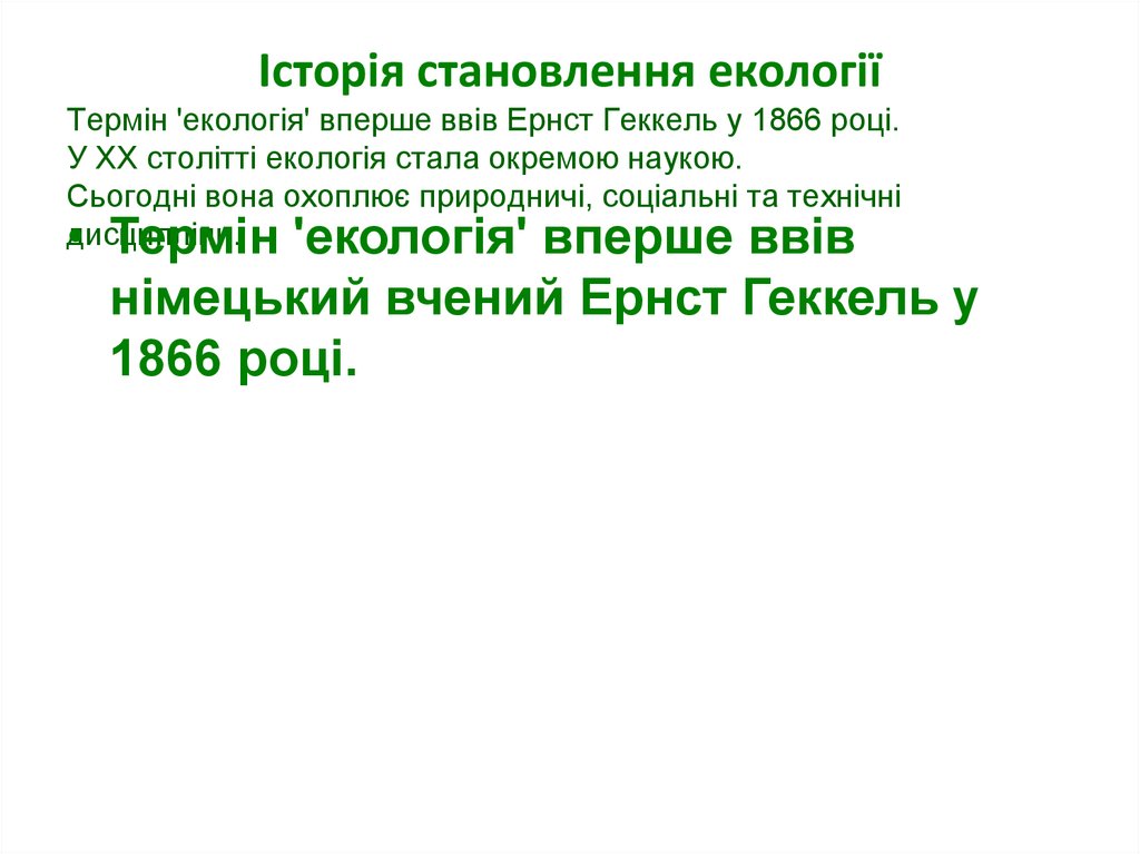 Історія становлення екологіїТермін 'екологія' вперше ввів Ернст Геккель у 1866 році.