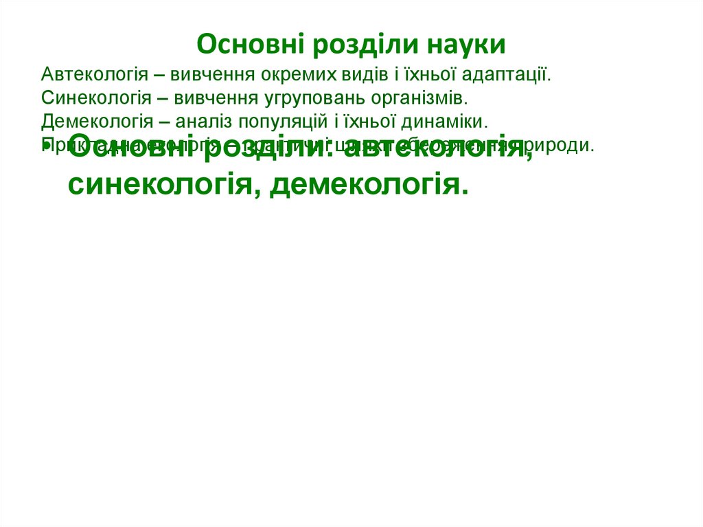 Основні розділи наукиАвтекологія – вивчення окремих видів і їхньої адаптації.
