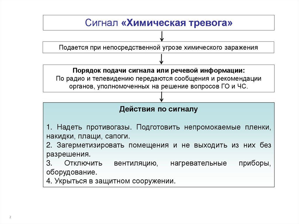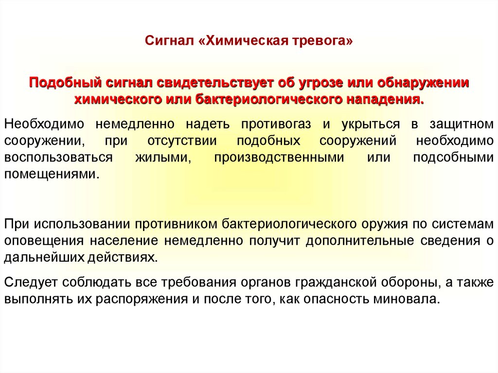 Сигнал «Химическая тревога»Подобный сигнал свидетельствует об угрозе или обнаружении