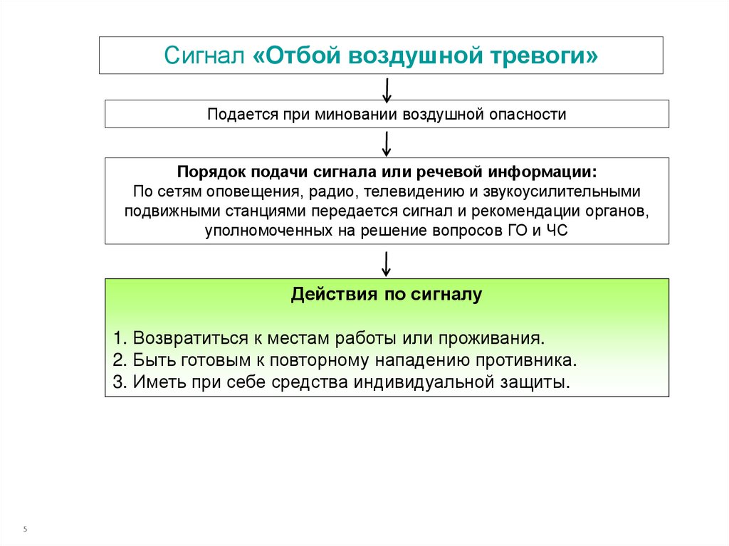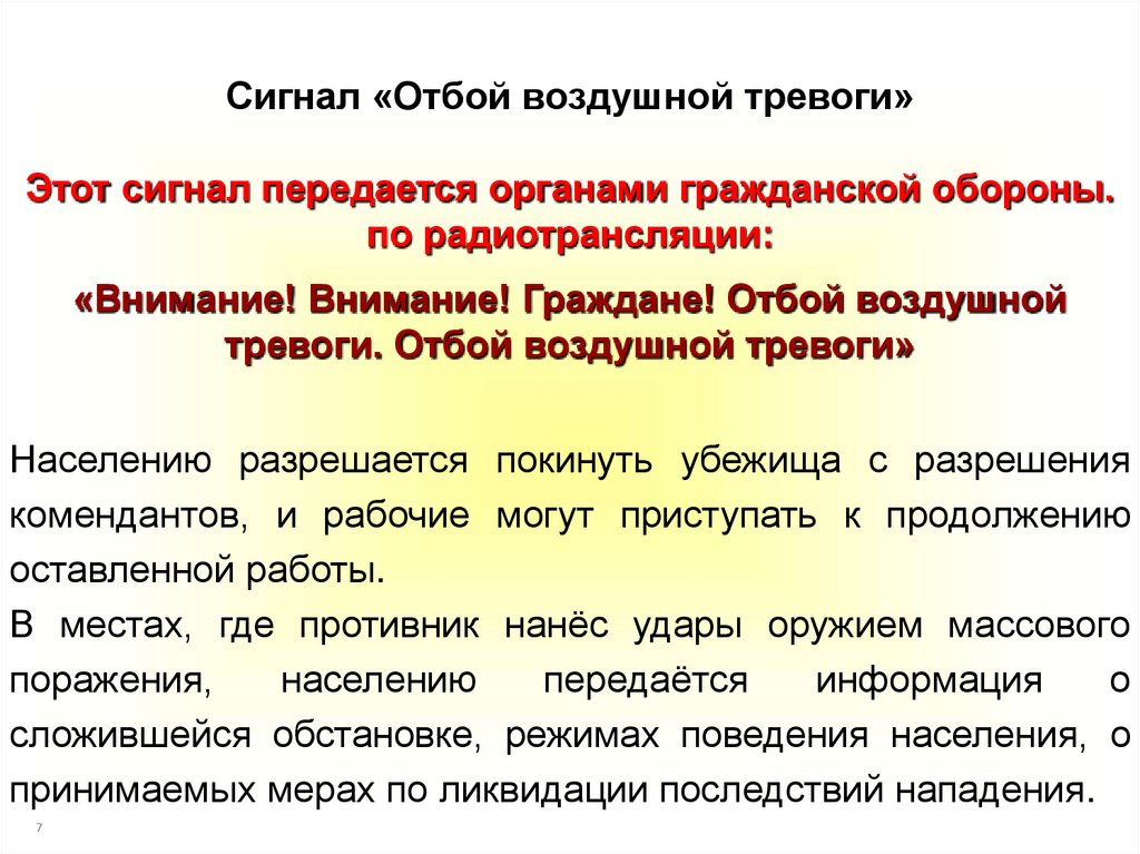 Сигнал «Отбой воздушной тревоги»Подается при миновании воздушной опасности