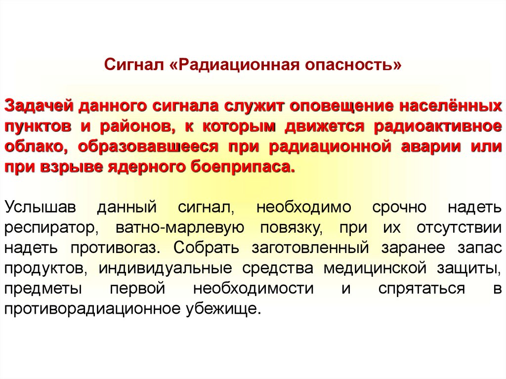 Сигнал «Радиационная опасность»Задачей данного сигнала служит оповещение населённых