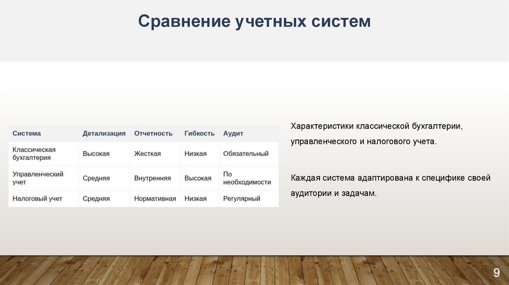Сравнение учетных системХарактеристики классической бухгалтерии,