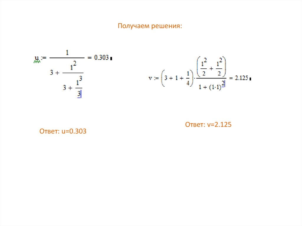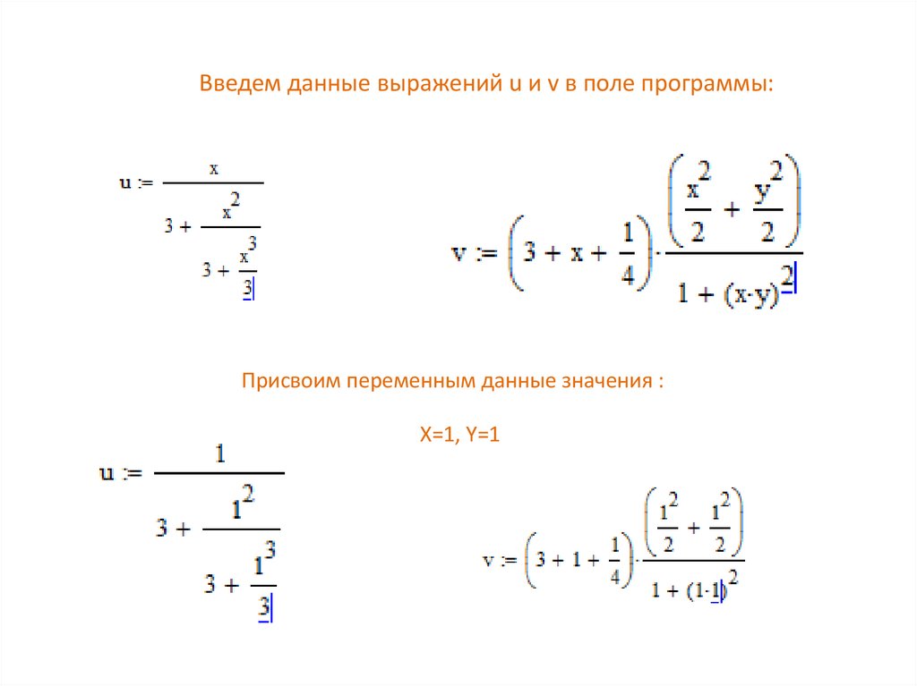 Введем данные выражений u и v в поле программы:Присвоим переменным данные значения :