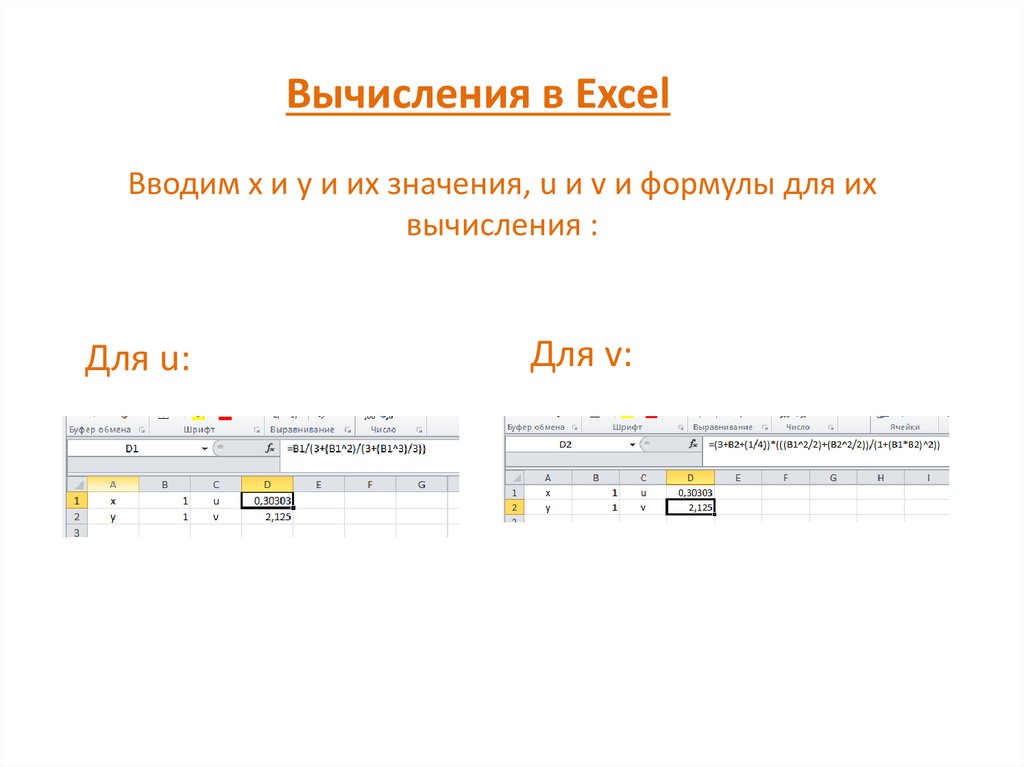 Вычисления в ExcelВводим x и y и их значения, u и v и формулы для их