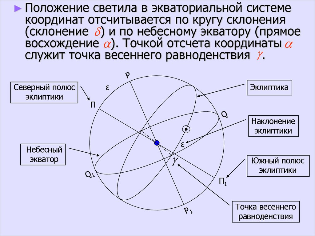 ► Положение светила в экваториальной системекоординат отсчитывается по кругу склонения