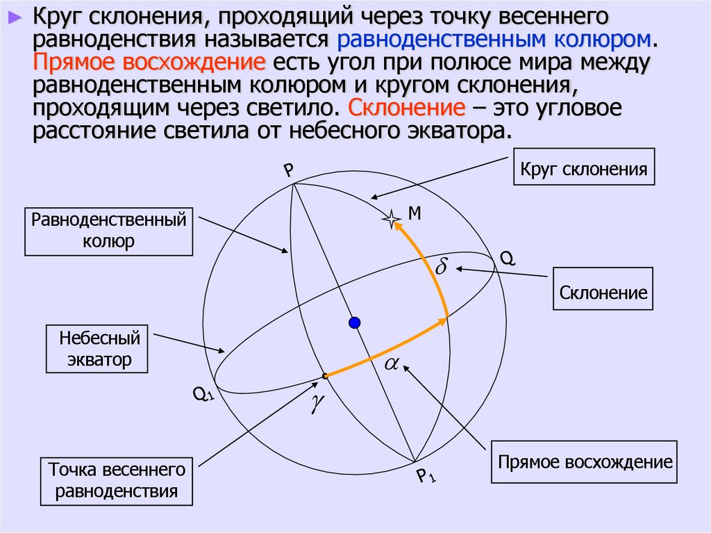 ► Круг склонения, проходящий через точку весеннегоравноденствия называется равноденственным колюром.
