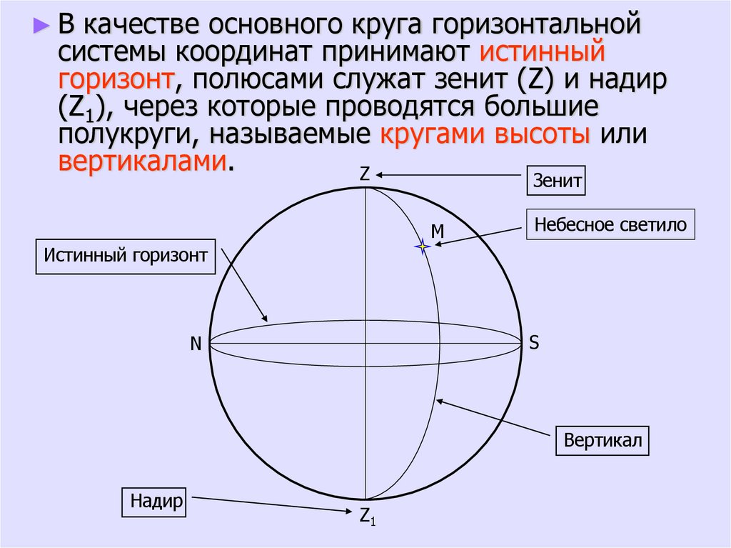 горизонт, полюсами служат зенит (Z) и надир
