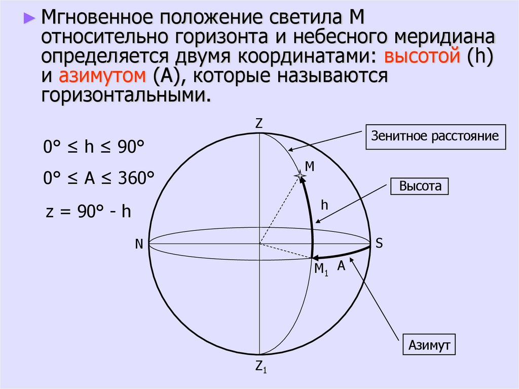 ► Мгновенное положение светила Mотносительно горизонта и небесного меридиана