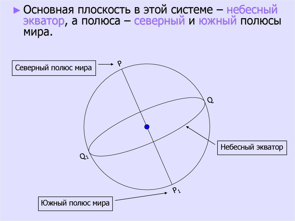 ► Основная плоскость в этой системе – небесныйэкватор, а полюса – северный и южный полюсы