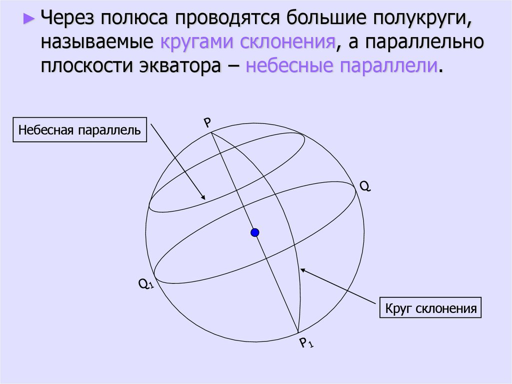 ► Через полюса проводятся большие полукруги,называемые кругами склонения, а параллельно