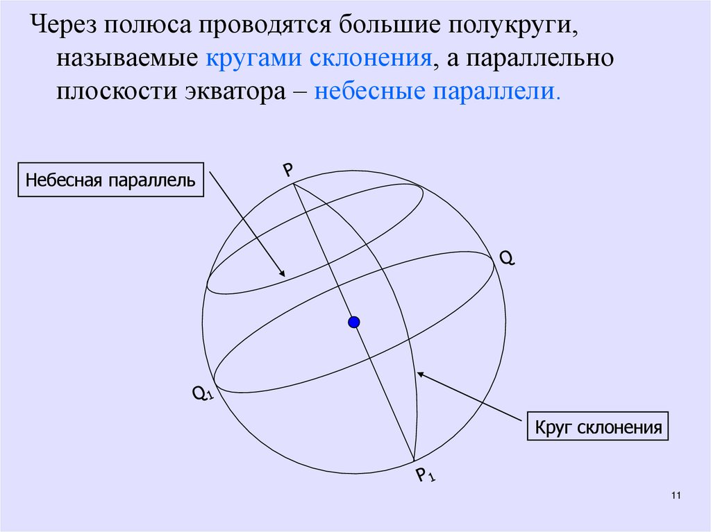 Через полюса проводятся большие полукруги,называемые кругами склонения, а параллельно