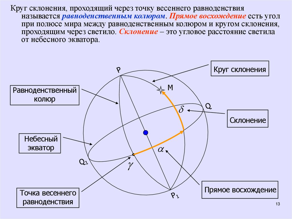Круг склонения, проходящий через точку весеннего равноденствияназывается равноденственным колюром. Прямое восхождение есть угол