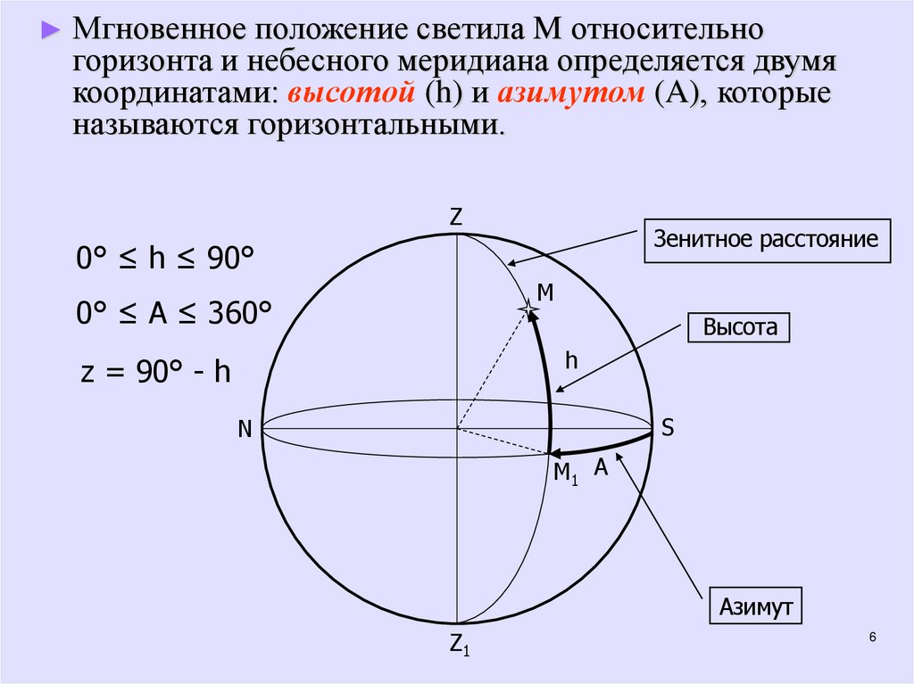 ► Мгновенное положение светила M относительногоризонта и небесного меридиана определяется двумя