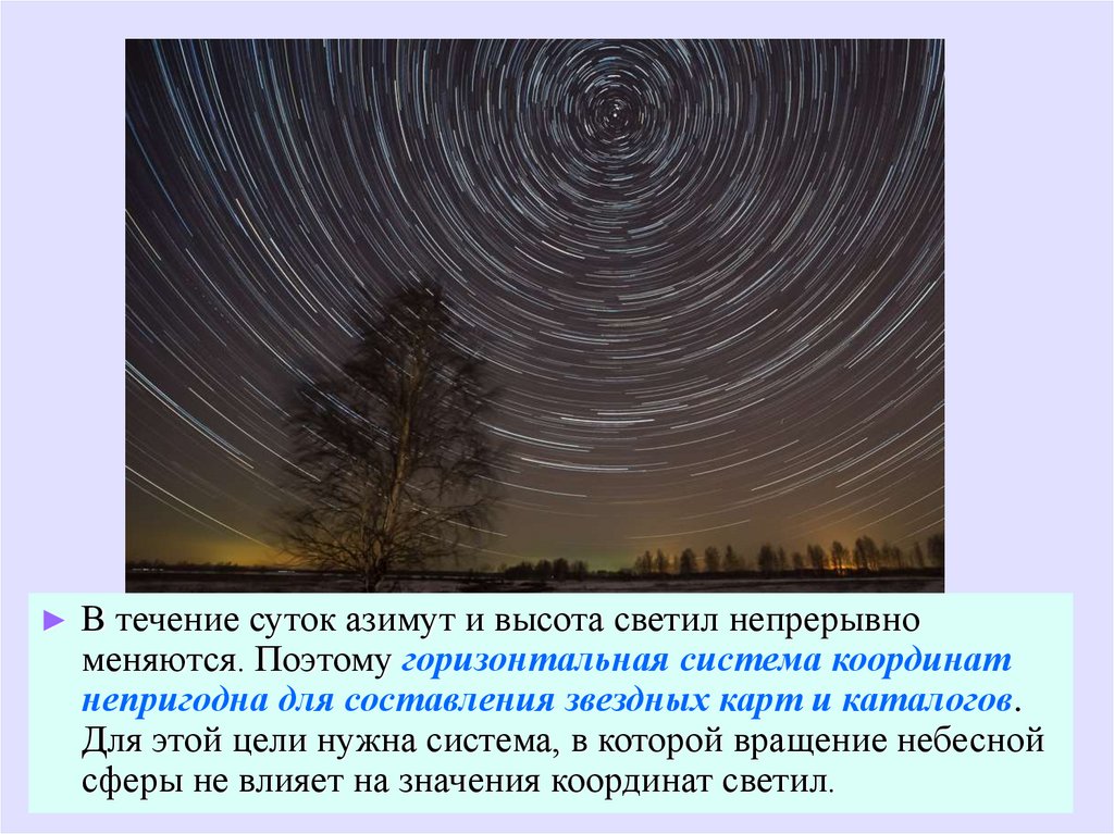 ► В течение суток азимут и высота светил непрерывноменяются. Поэтому горизонтальная система координат
