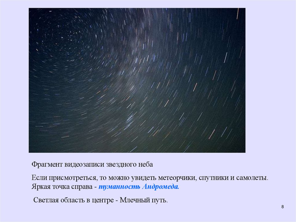 Фрагмент видеозаписи звездного небаЕсли присмотреться, то можно увидеть метеорчики, спутники и самолеты.