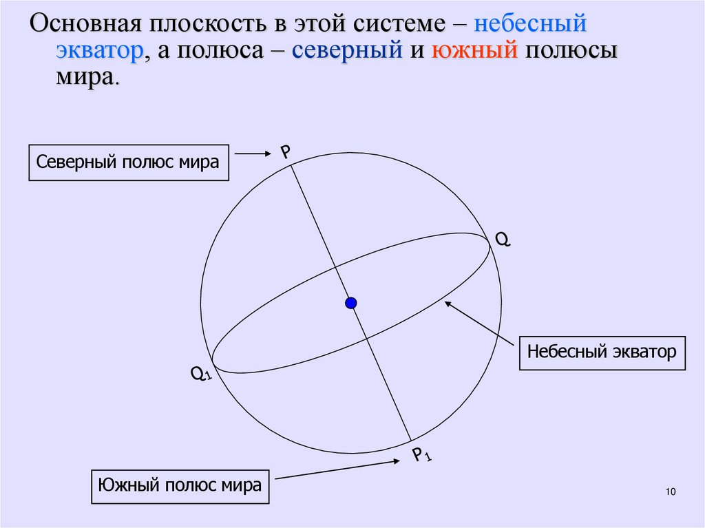 Основная плоскость в этой системе – небесныйэкватор, а полюса – северный и южный полюсы