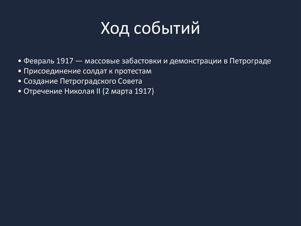Ход событий• Февраль 1917 — массовые забастовки и демонстрации в Петрограде