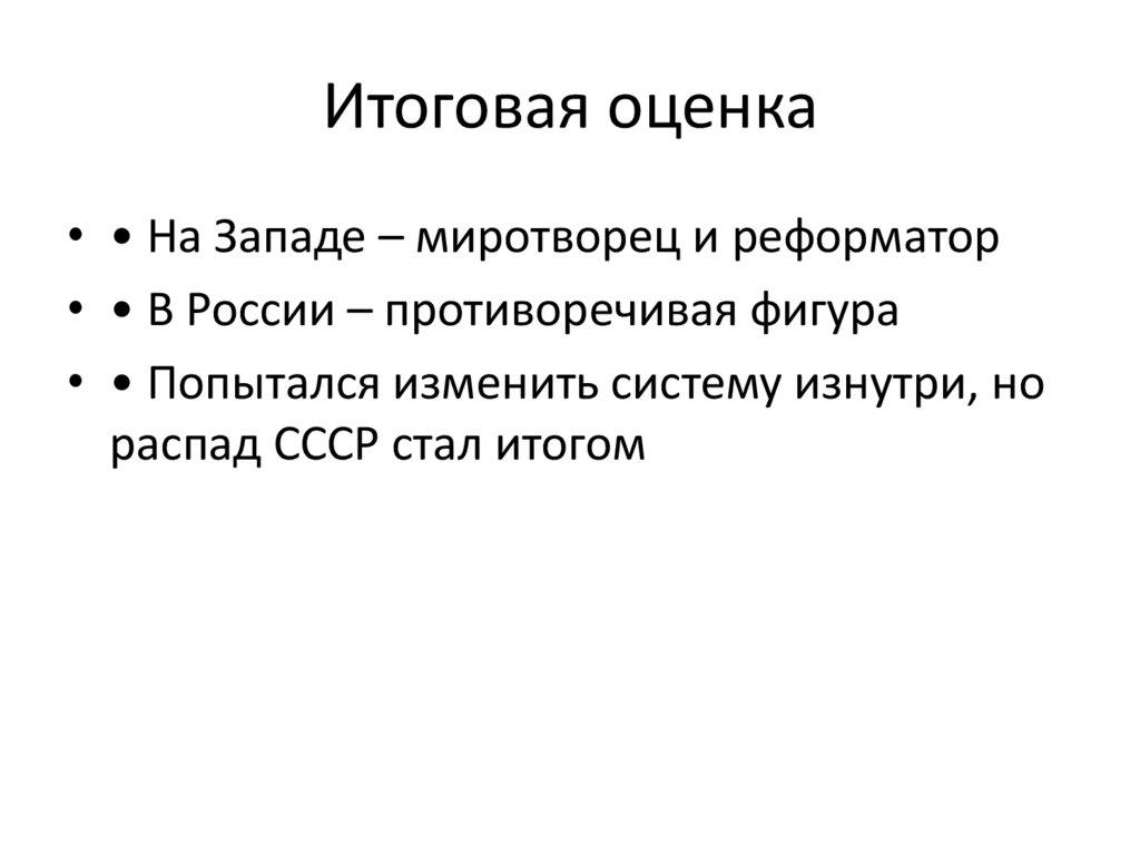 Итоговая оценка• • На Западе – миротворец и реформатор
