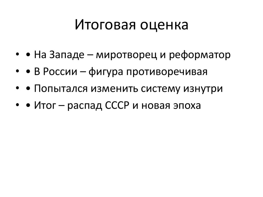 Итоговая оценка• • На Западе – миротворец и реформатор