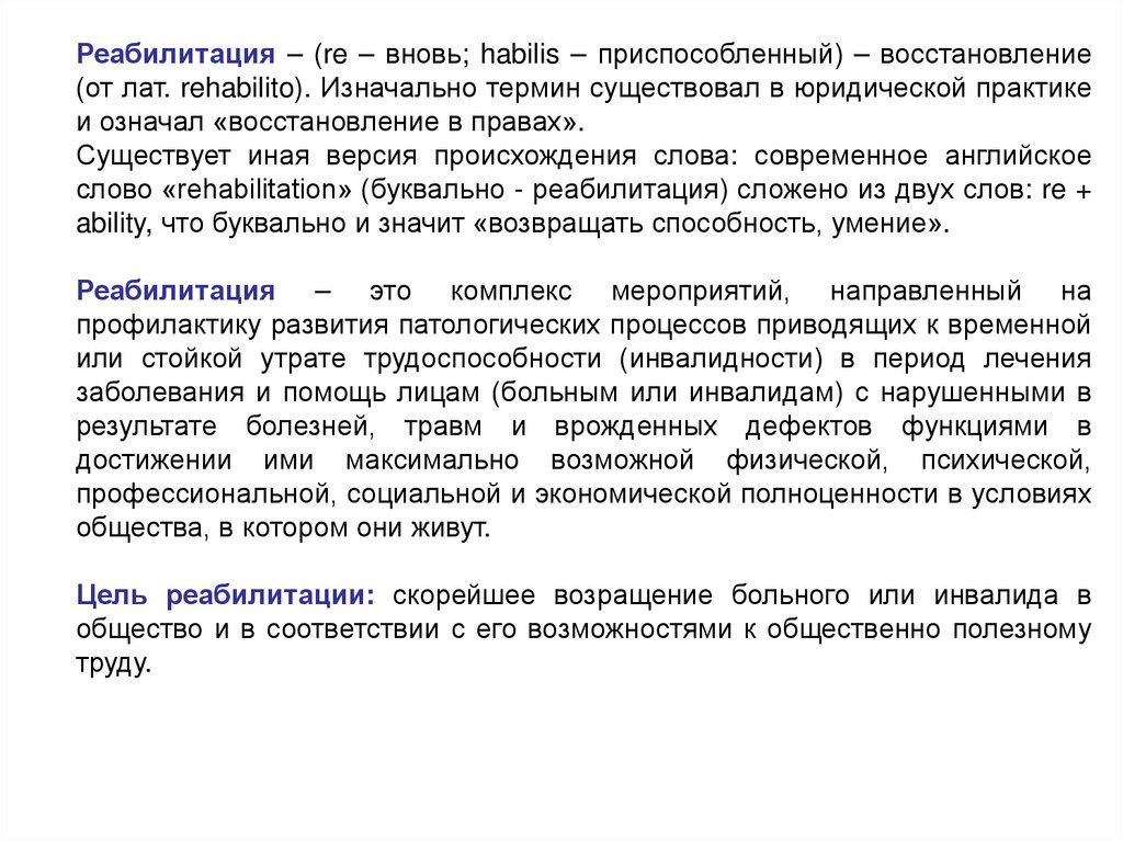 Реабилитация – (re – вновь; habilis – приспособленный) – восстановление(от лат. rehabilito). Изначально термин существовал в юридической практике