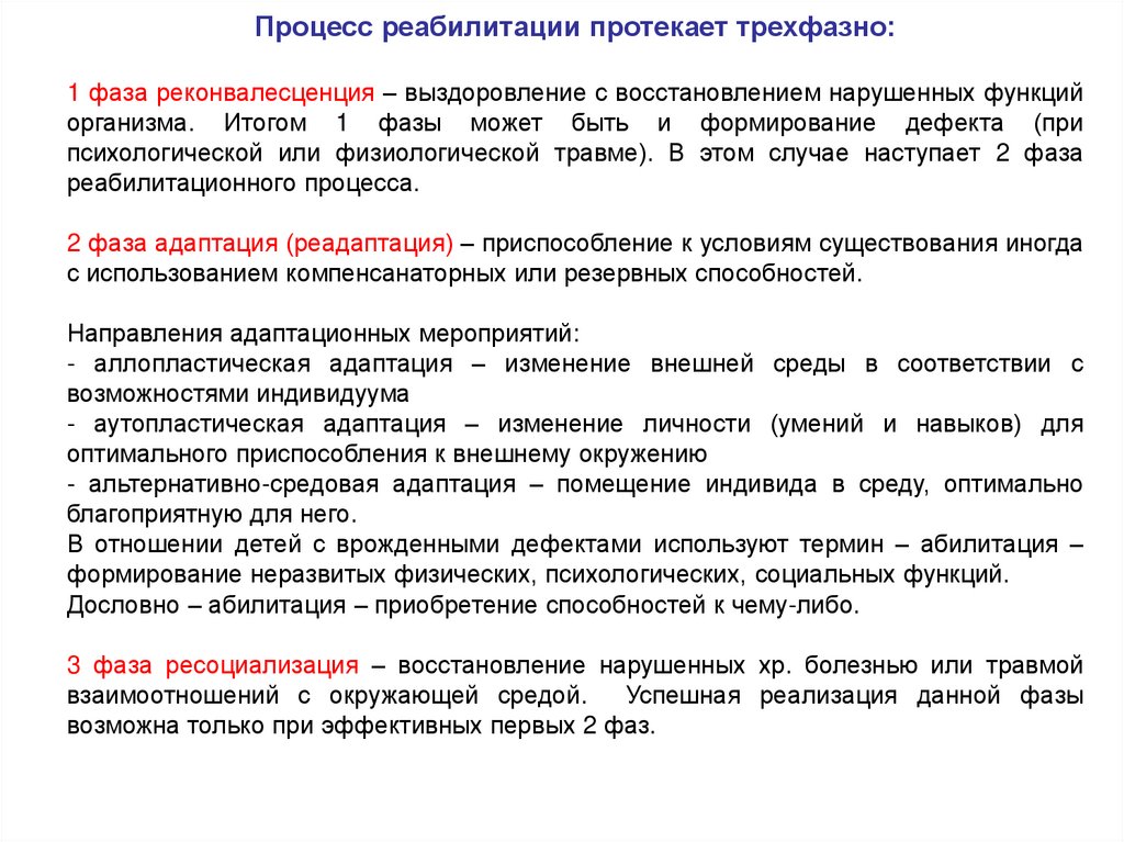 Процесс реабилитации протекает трехфазно:1 фаза реконвалесценция – выздоровление с восстановлением нарушенных функций