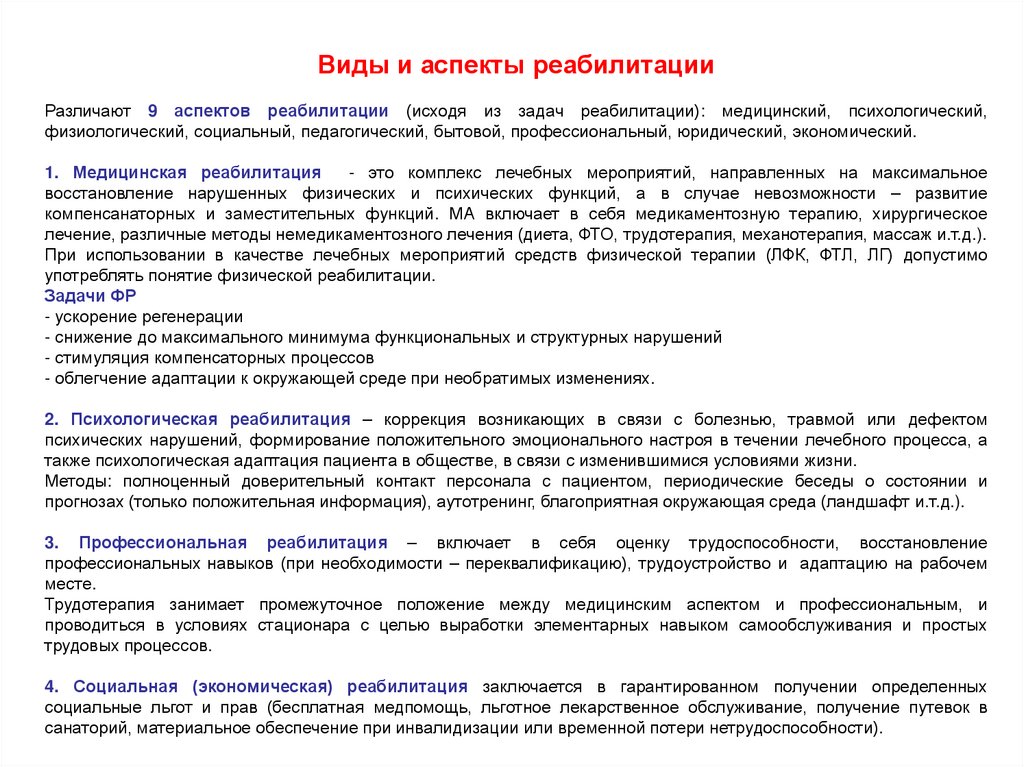 Виды и аспекты реабилитацииРазличают 9 аспектов реабилитации (исходя из задач реабилитации): медицинский, психологический,