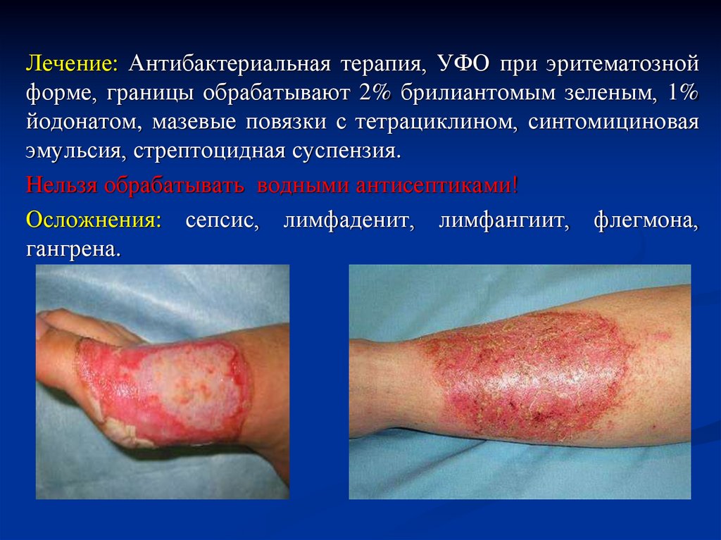 Лечение: Антибактериальная терапия, УФО при эритематознойформе, границы обрабатывают 2% брилиантомым зеленым, 1%