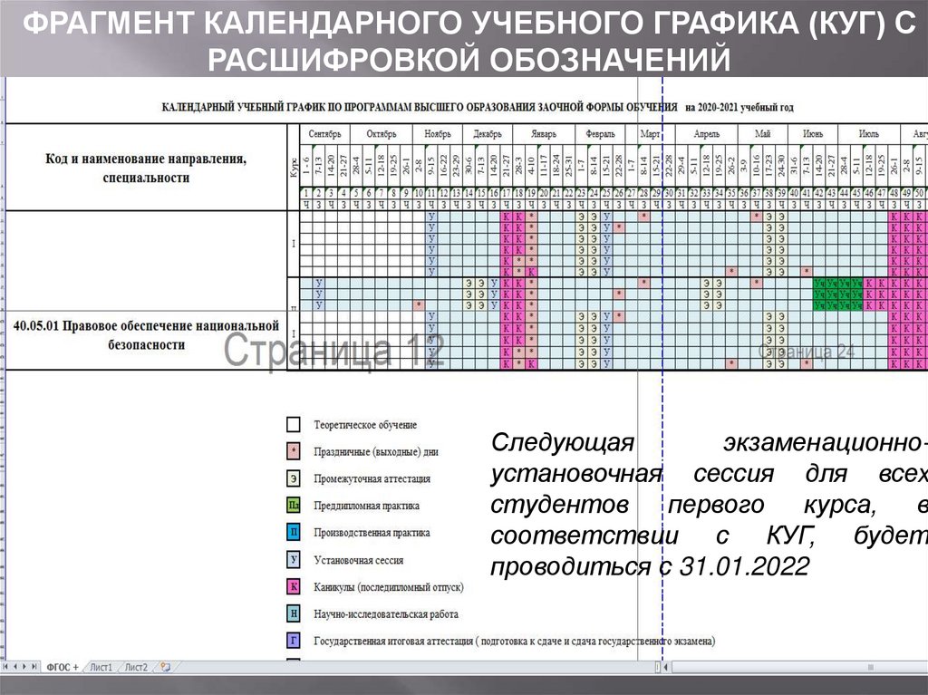 ФРАГМЕНТ КАЛЕНДАРНОГО УЧЕБНОГО ГРАФИКА (КУГ) СРАСШИФРОВКОЙ ОБОЗНАЧЕНИЙ