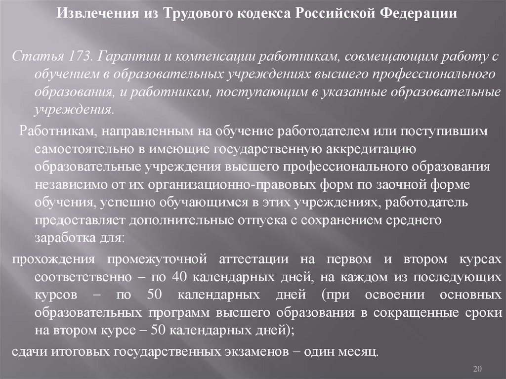 Извлечения из Трудового кодекса Российской ФедерацииСтатья 173. Гарантии и компенсации работникам, совмещающим работу с