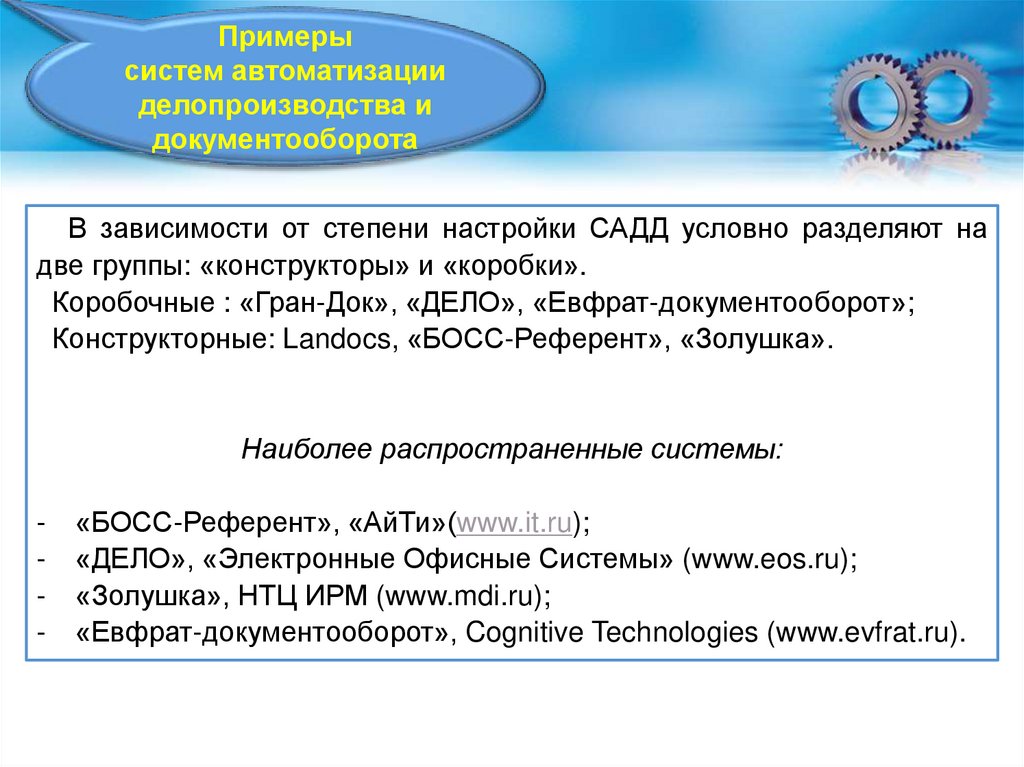 Коробочные : «Гран-Док», «ДЕЛО», «Евфрат-документооборот»;