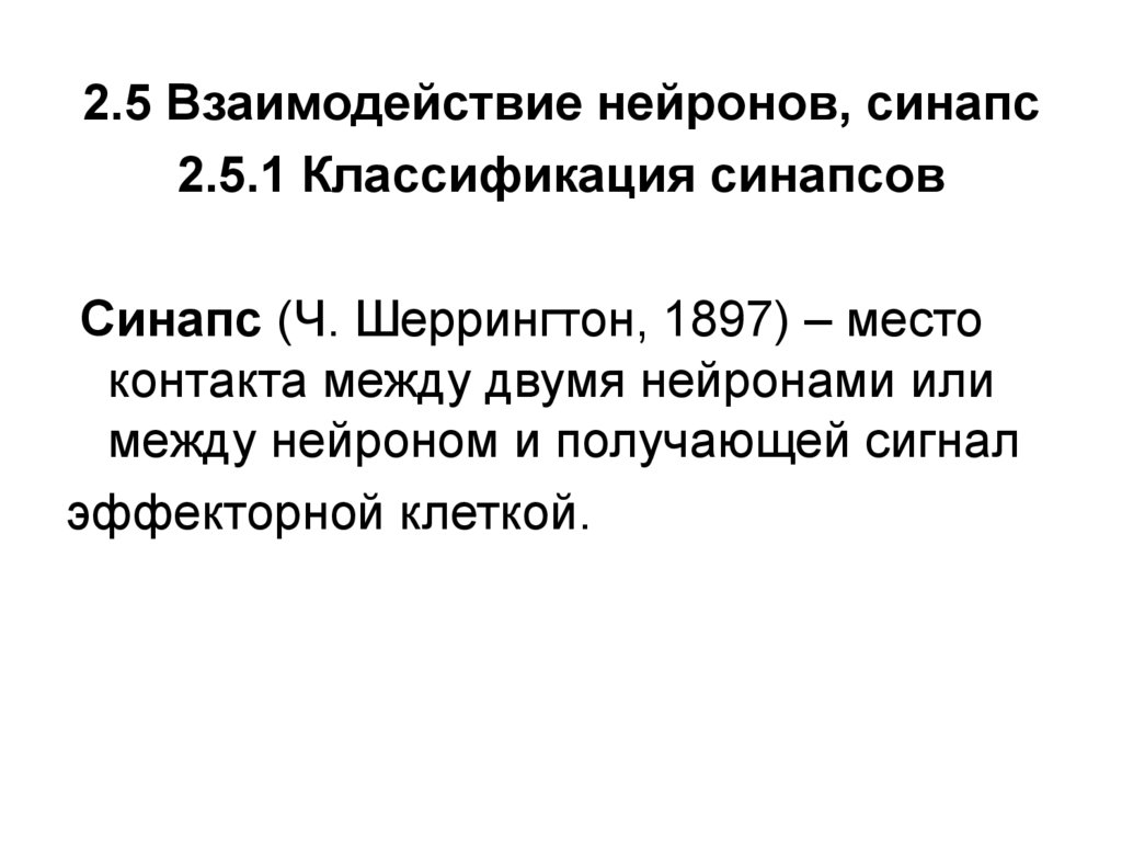 2.5 Взаимодействие нейронов, синапс2.5.1 Классификация синапсов