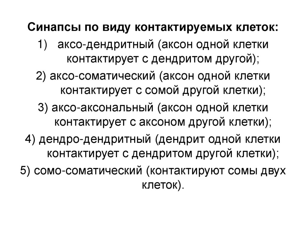 Синапсы по виду контактируемых клеток:1) аксо-дендритный (аксон одной клетки