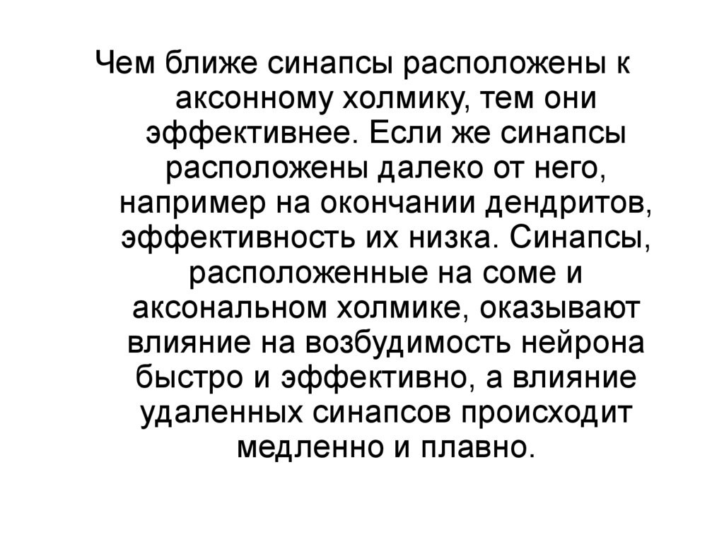 Чем ближе синапсы расположены каксонному холмику, тем они