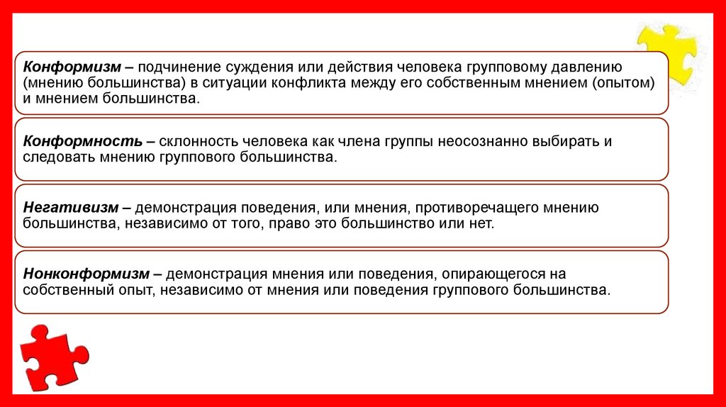 Конформизм – подчинение суждения или действия человека групповому давлению(мнению большинства) в ситуации конфликта между его собственным мнением (опытом)