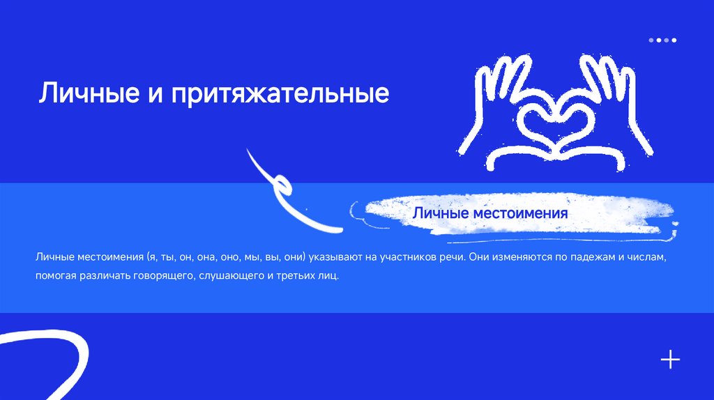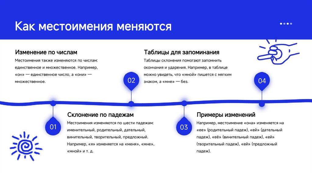Личные местоимения (я, ты, он, она, оно, мы, вы, они) указывают на участников речи. Они изменяются по падежам и числам,