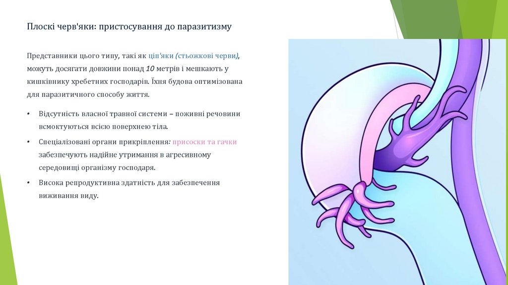Плоскі черв'яки: пристосування до паразитизмуПредставники цього типу, такі як ціп'яки (стьожкові черви),