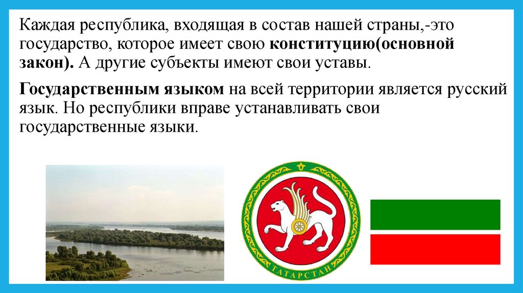 Каждая республика, входящая в состав нашей страны,-этогосударство, которое имеет свою конституцию(основной