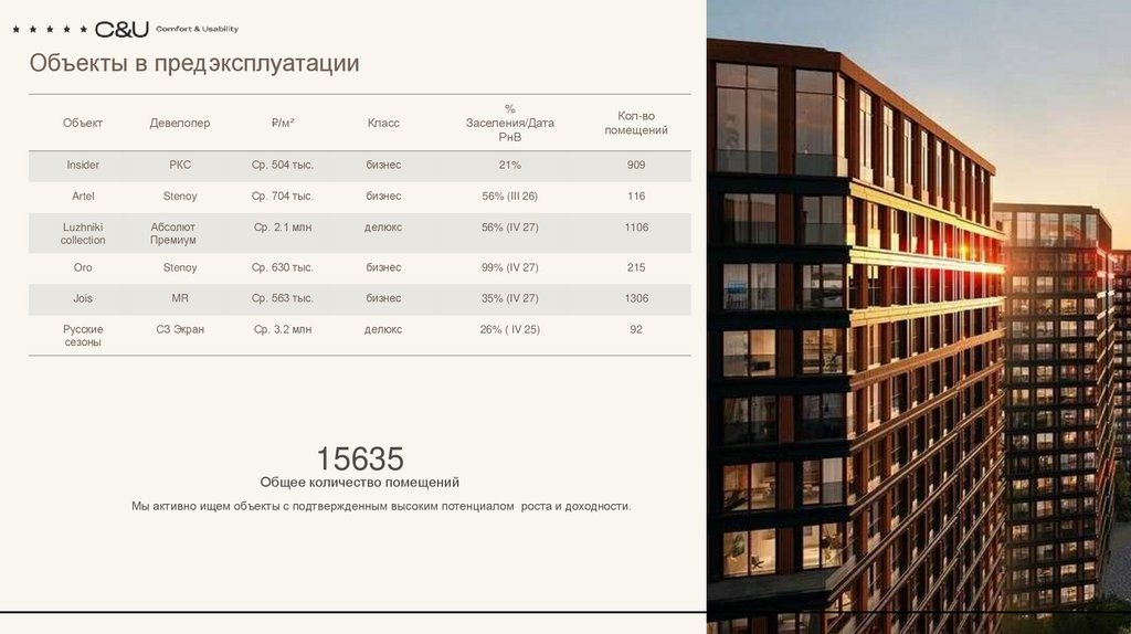 Мы активно ищем объекты с подтвержденным высоким потенциалом роста и доходности.